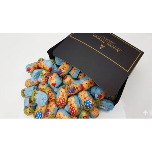 Σοκολατένια μικρά παπάκια με διάφορες πασχαλινές παραστάσεις σε περιτύλιγμα. Γάλακτος με γέμιση α..